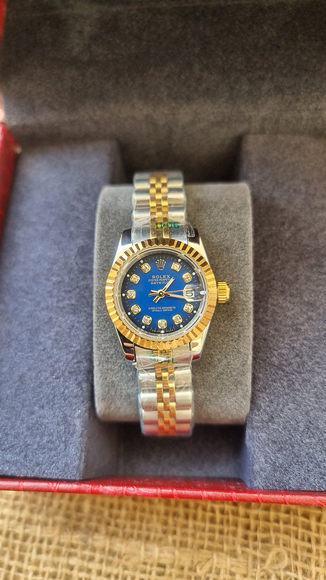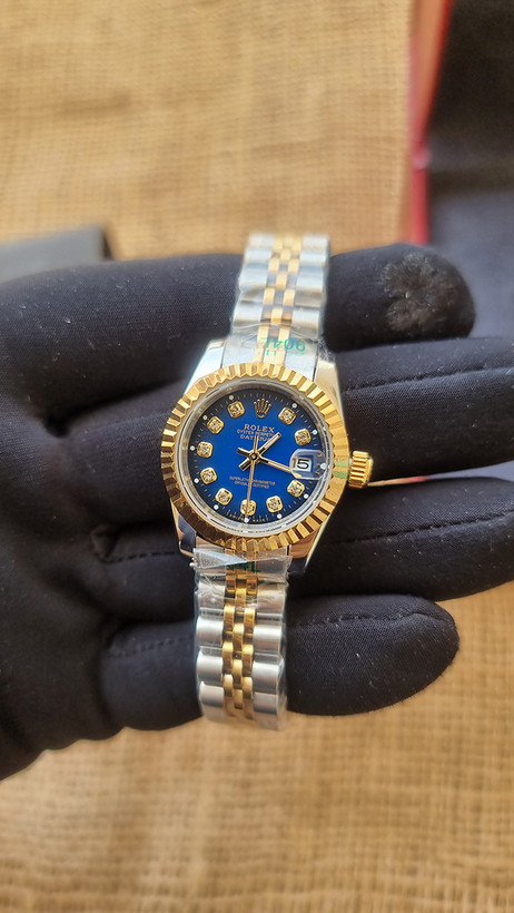 ساعت مچی زنانه رولکس دیت جاست سایز کوچک بند طلایی نقره ای صفحه آبی Date just 26mm