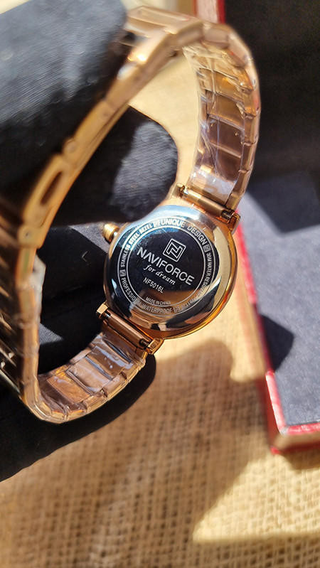 ساعت مچی زنانه ناوی فورس اورجینال رزگلد صفحه صدفی با طرح گل وستاره