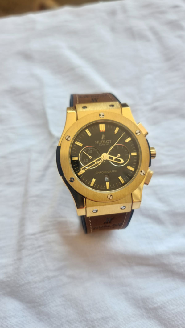 ساعت مچی مردانه هابلو(هابلوت) کرنوگراف کلاسیک بند خردلی قاب طلایی صفحه مشکی